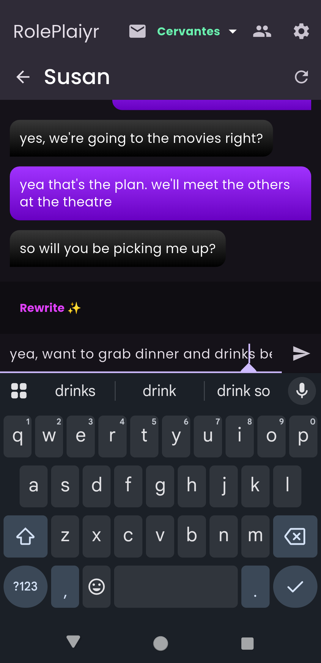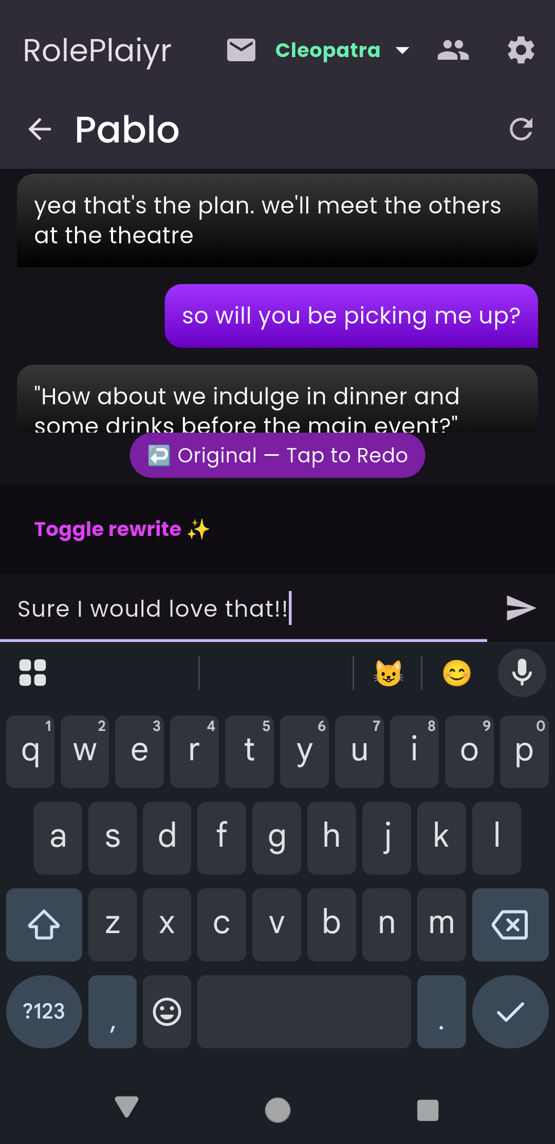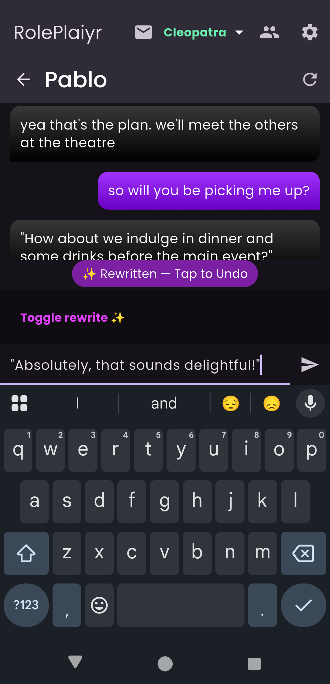No. RolePlaiyr doesn’t chat with you or pretend to be a person. It only helps rewrite messages you choose.